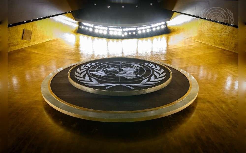 A view of the United Nations emblem in the General Assembly Hall in the morning of the third day of the 80th session of the General Assembly Debate on September 25,2025-UN Photo/Loey Felipe
