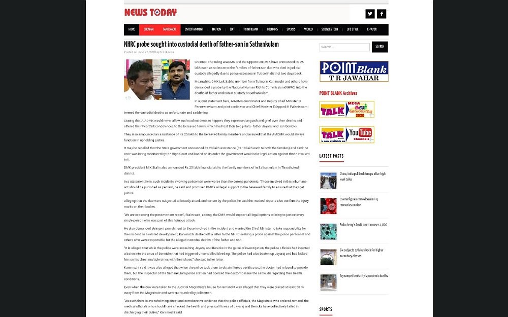 P. Jeyaraj and J. Beniks, were picked up by the police n the evening of June 19 on a trivial charge. It has been alleged that Jeyaraj, 62, was working at his mobile shop at Sathankulam town when he was picked up by the police. It has been alleged that Jeyaraj had made some critical remarks about a police patrol team the day before for forcing shop owners to close their shops early because of lockdown rules. It has been reported that this comment was reported to the police by an auto driver and the police team had come the next day and took him in custody. Jeyaraj’s son J Bennix, 32, followed the police team to the station and he was also arrested along with his father on petty charges. It is alleged that the father and son were mercilessly beaten up the entire night inside the police lockup. They were taken to the local hospital after their condition worsened but were pronounced brought dead. All three accused policemen in the case have been arrested as of Friday.