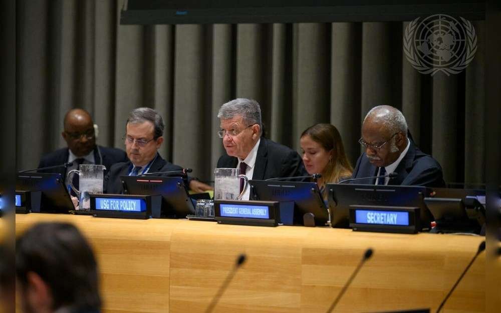 informal interactive dialogue of the United Nations General Assembly on the implementation of the Pact for the Future. The dialogue focused on monitoring and evaluation. At right is Philemon Yang, President of the seventy-ninth session of the United Nations General Assembly on May 19,2025-UN Photo/Loey Felipe