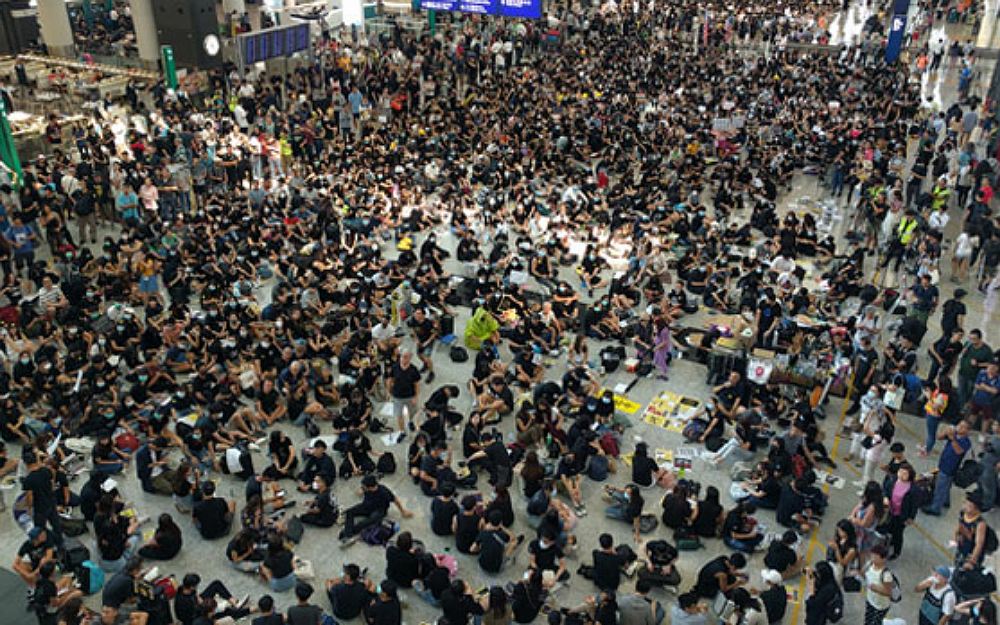 Thousands of anti-extradition protesters gathered in the arrivals hall of the Hong Kong International Airport on Friday, greeting new arrivals to the city with a rendition of “Do You Hear The People Sing!” in English and recent video footage of police violence against them.