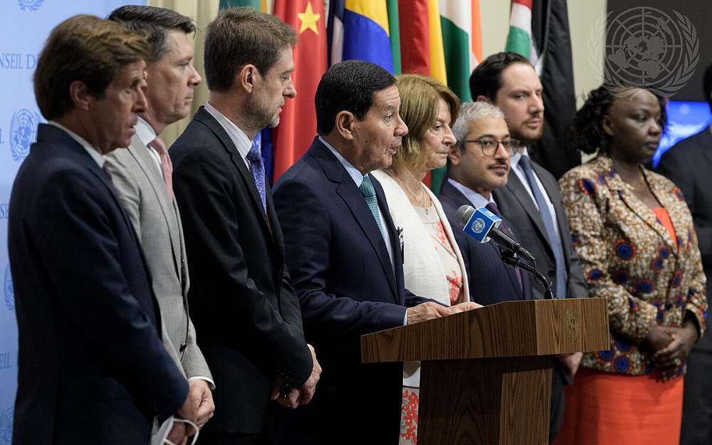 Along with representatives of Albania, Ireland, Kenya, Mexico, Norway, the United Kingdom, and the United Arab Emirates,Vice-President of Brazil and President of United Nations Security Council for the month of July Antônio Hamilton Martins Mouro briefs reporters on the joint initiative for women, peace, and security in Haiti on July 21,2022 –UN Photo by Manuel Elias