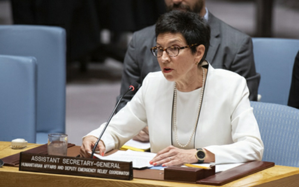Ursula Mueller, Assistant Secretary-General for Humanitarian Affairs and Deputy Emergency Relief Coordinator, briefs the Security Council meeting on the situation in the Middle East (Syria) on 28 May~ UN Photo by Eskinder Debebe