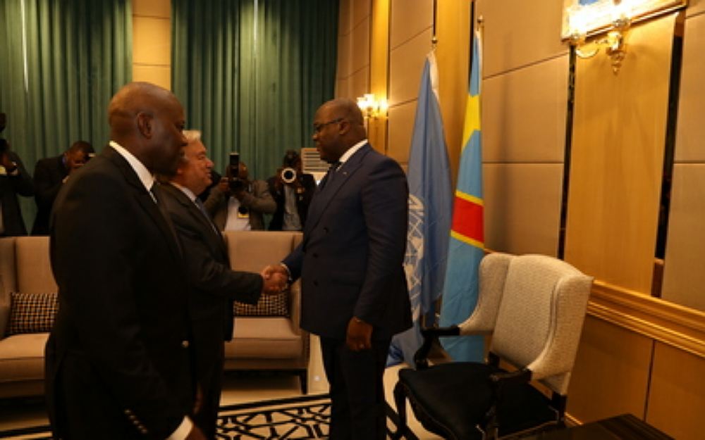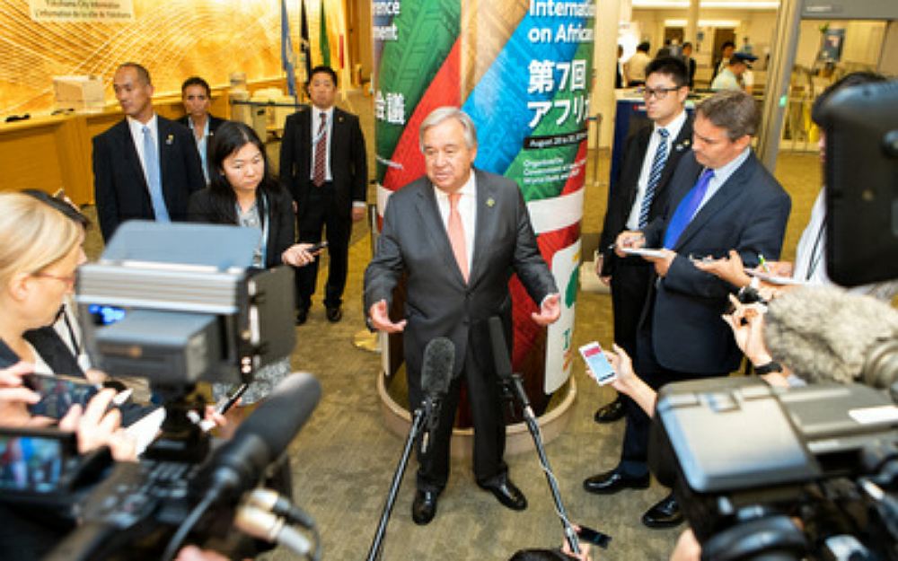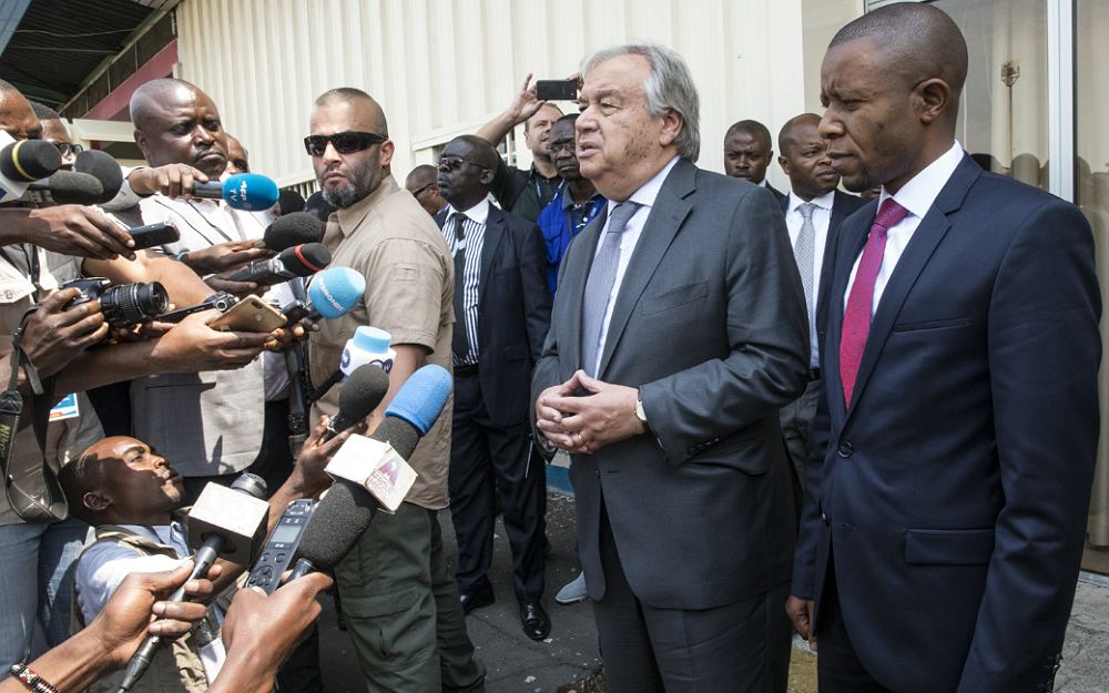 António Guterres (left) visits Camp-de-vie in Mangina, a residence of Ebola medical workers on 1 September 2019 ~UN PhotoAntónio Guterres (second from left) meets with Félix Antoine Tshilombo Tshisekedi (right), President of the Democratic Republic of the Congo on 2 September 2019Kinshasa, Democratic Republic of the Congo~UN Photo by Michael Ali United Nations Secretary-General António Guterres (centre) briefs the media following his meeting with Carly Nzanzu Kasivita (right), Governor of North Kivu. Secretary-General arrived in the town of Goma, situated in the North Kivu, Democratic Republic of the Congo, where civilians are facing insecurity and ongoing health crises, including a year-long Ebola epidemic which has claimed more than 2,000 lives on 31 August 2019~UN Photo by Martine PerretUnited Nations Secretary-General António Guterres visited Yokohama, Japan, to attend the 7th Tokyo International Conference on African Development (TICAD). Mr. Guterres also attended a special conference on peace and stability in the Horn of Africa and the neighbouring region, and a thematic session on climate change and disaster risk reduction.Mr. Guterres (right) meets with Shinzo Abe, Prime Minister of Japan on 28 August 2019~ UN Photo by Ichiro Maetónio Guterres (centre) briefs press after the Tokyo International Conference on African Development’s (TICAD) thematic session on climate change and disaster risk reduction, in Yokohama, Japan on 29 August 2019~UN Photo by Ichiro Mae
