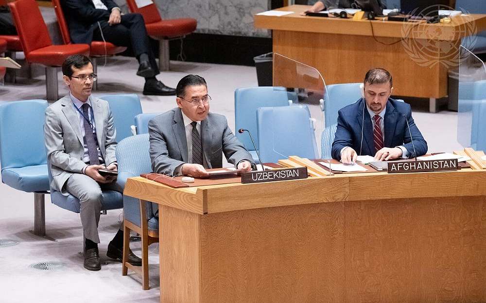 The Republic of Uzbekistan’s Permanent Representative to the UN, Bakhtiyor Ibragimov (left), speaks before the Security Council about the situation in Afghanistan and its effects on global peace and security. Naseer Ahmed Faiq, Minister Counsellor of the Permanent Mission of Afghanistan to the United Nations, is pictured to the right on Jiune 23,2022- UN Photo by Evan Schneider